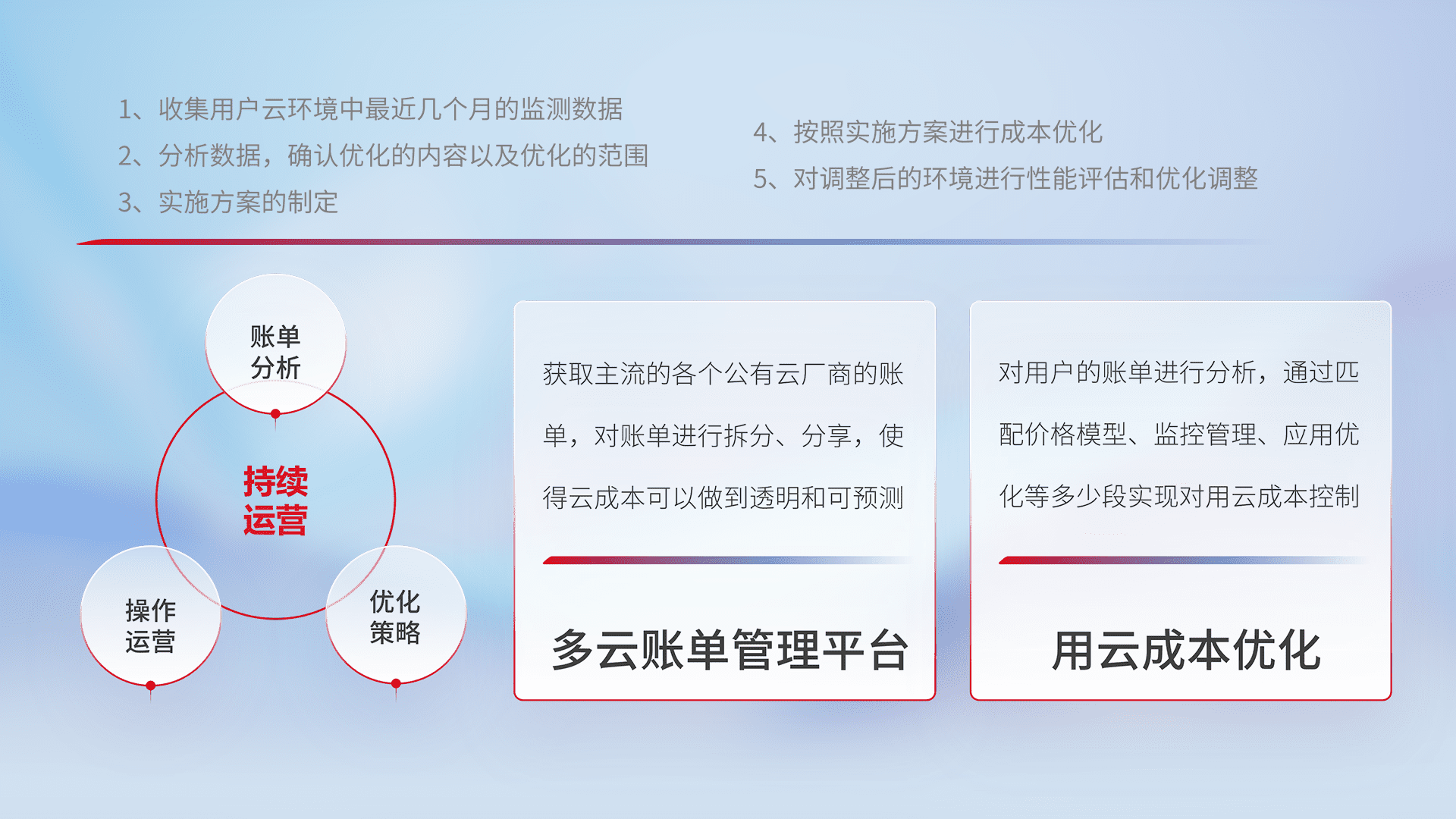 通过多云纳管,,以统一的资源数据模型把客户的云资源进行抽象和封装,,,进而实现对多云资源的统一操作,,,保障云资源管理的可靠性、、、稳定性与可用性。。。量身定制化运维内容,,,,配置、、开发运维、、、、补丁管理、、、备份、、、、监控、、、、认证和访问管理、、、、审计和日常巡检等,,,保障在用云过程中的可靠度,,,稳定度以及高可用率。。。